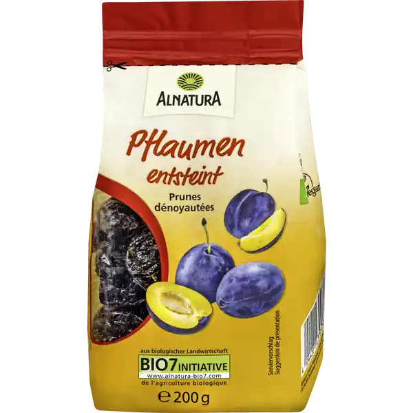 Mận Alnatura được bỏ hạt và trồng hữu cơ. Chúng không chứa lưu huỳnh (theo yêu cầu của luật thực phẩm hữu cơ) và được bảo quản bằng phương pháp sấy khô và thanh trùng – lớp phủ màu trắng có thể hình thành do kết tủa đường tự nhiên. |